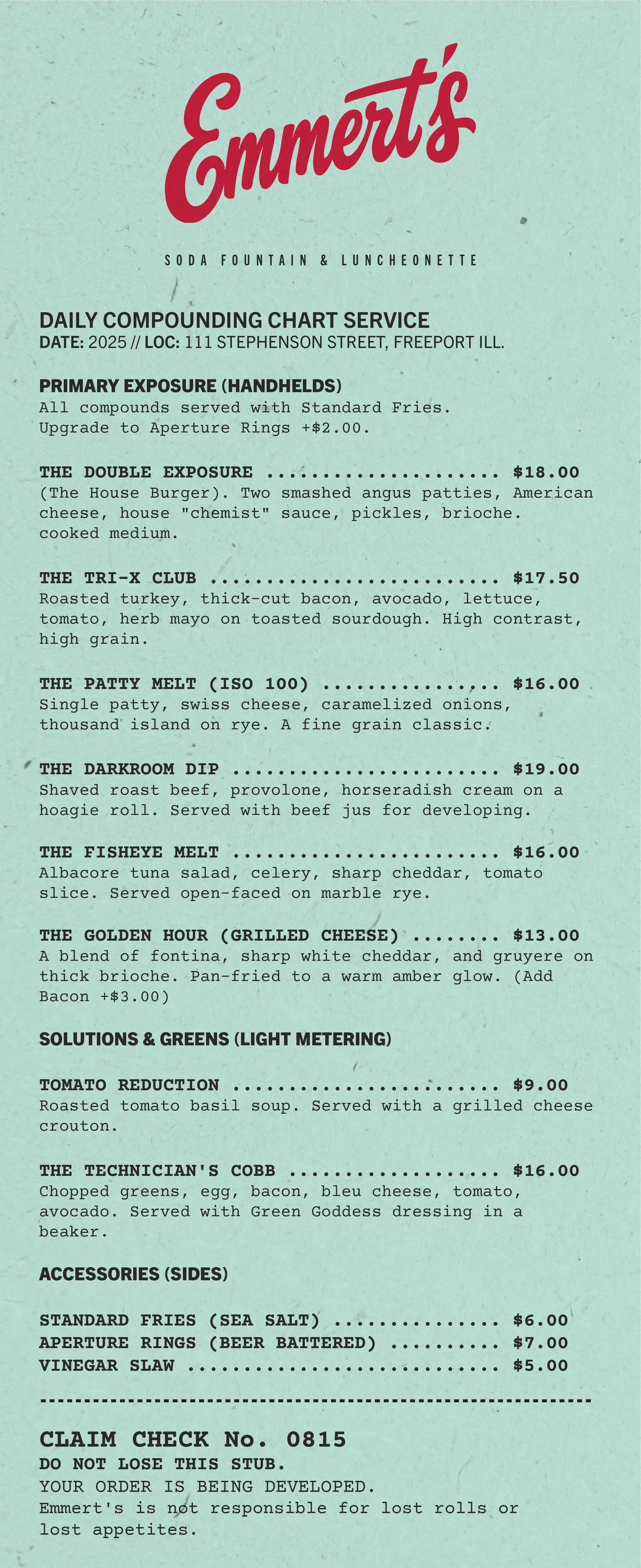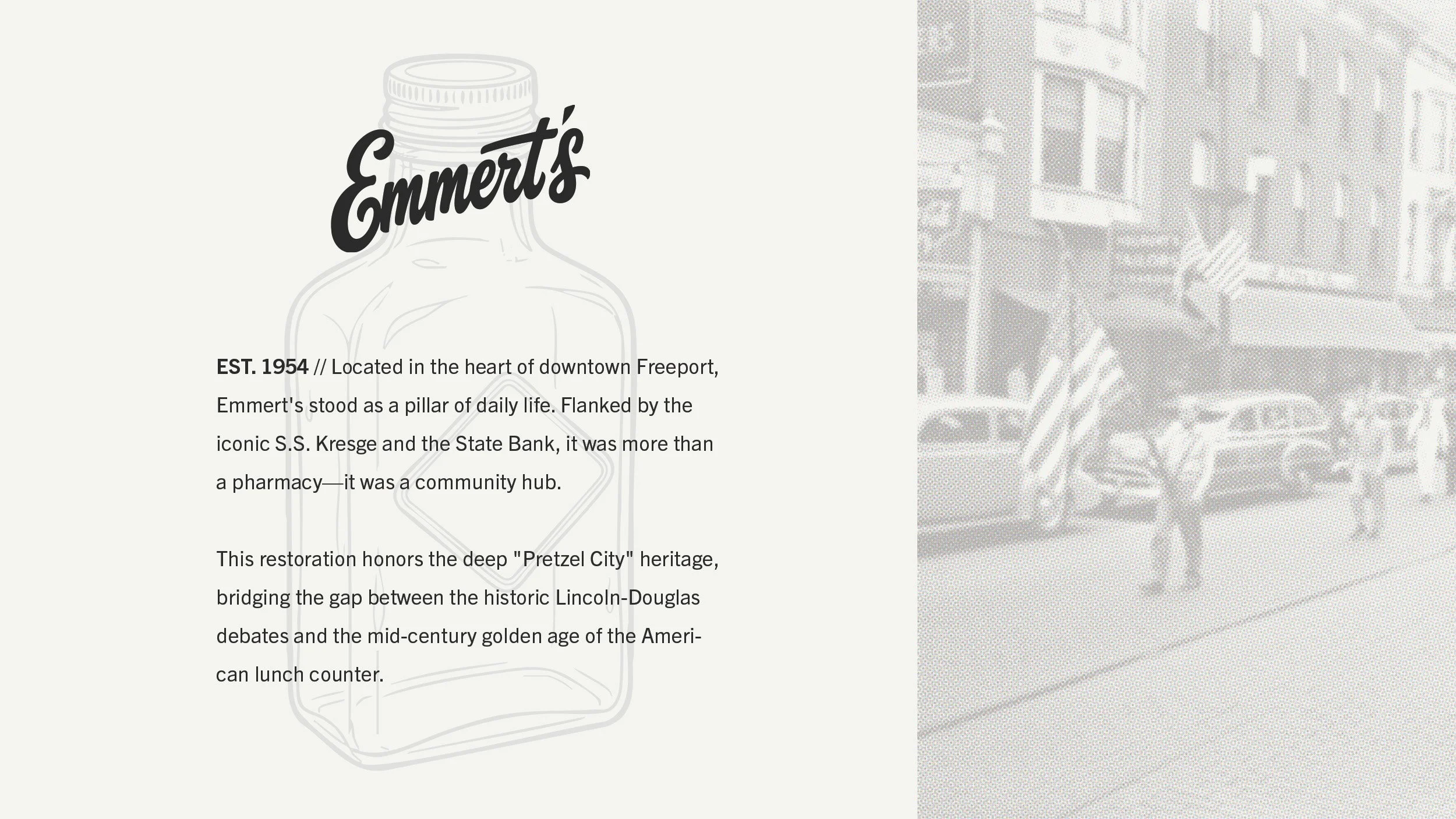 The goal was to restore the legacy of Emmert's (est. 1954), a historic Freeport institution, and reintroduce it to a modern audience. The challenge was bridging the gap between its authentic roots as a community hub, soda fountain, and its unusual past as a legendary camera supply counter.
